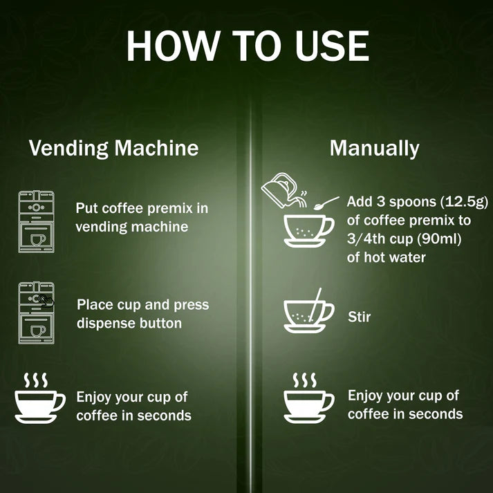 Instruction for Use – Dispense 12.5 g of premix with 90 ml hot water via vending machine or mix manually